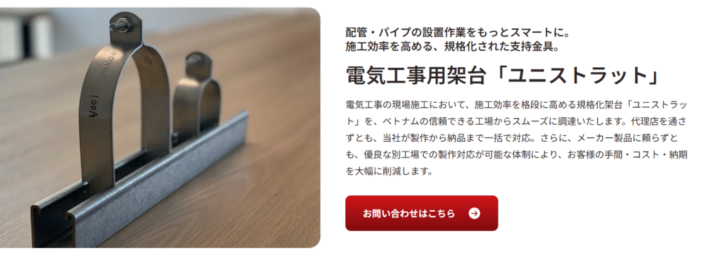 株式会社いわいは、日本ではまだ珍しい数少ないユニストラットサプライヤーです。ベトナムとの強固なネットワークを活かし、ユニストラットの調達から納品まで一貫してサポートしています。ユニストラットは海外ではホームセンターに置かれるほど普及していますが、日本ではまだ認知度が低く、供給体制も限られています。当社は、ユニストラットの選定から、設計サポート、製作、表面処理(亜鉛メッキ・塗装)、納品まで、ワンストップで対応しています。お客様の図面をもとに最適な部材を提案し、現場での組み立て方法もアドバイスいたします。
